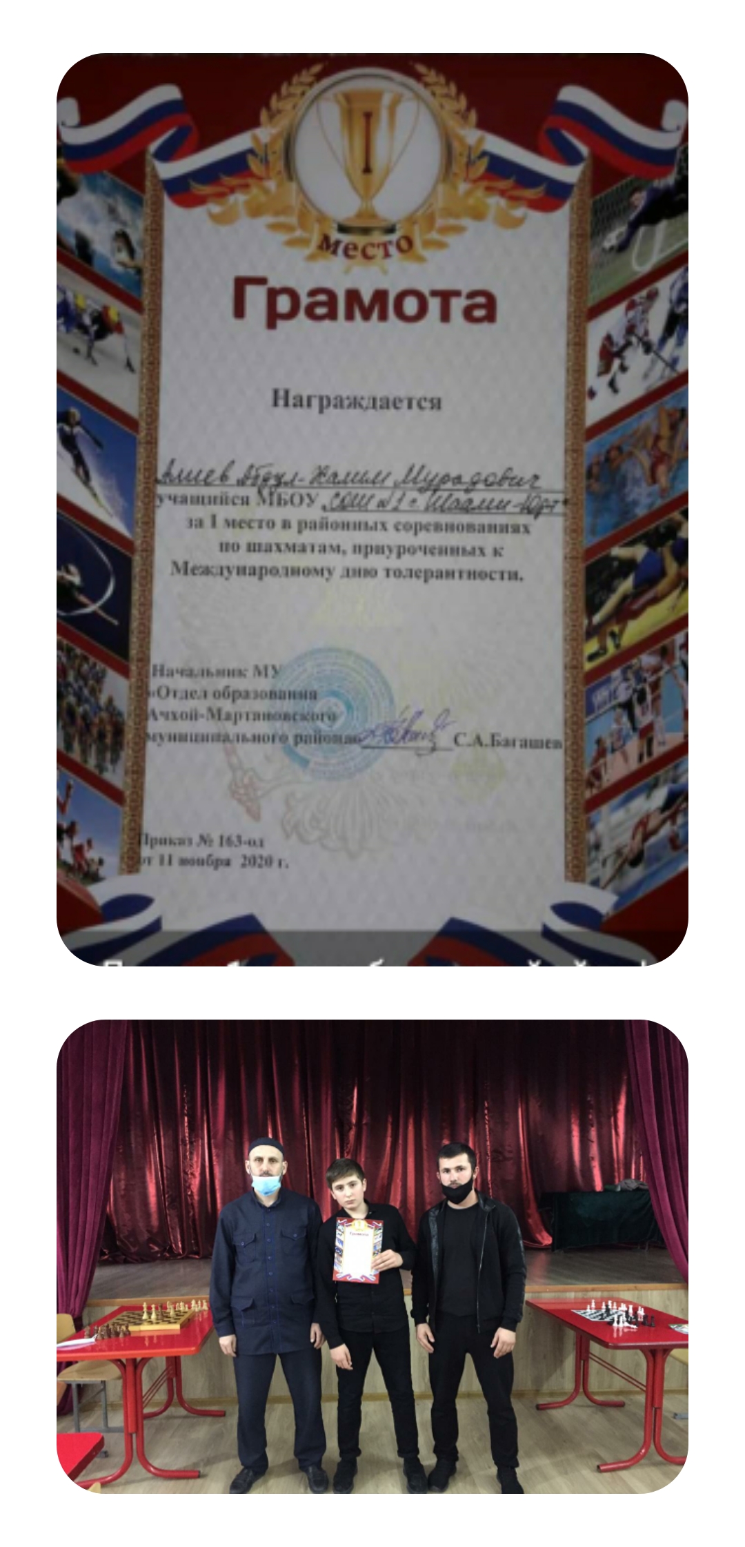 Ученик 9 "А" класса Алиев Абдул-Халим Мурадович участвовал в районных соревнованиях по шахматам, приуроченных к Международному дню толерантности и занял 1место.